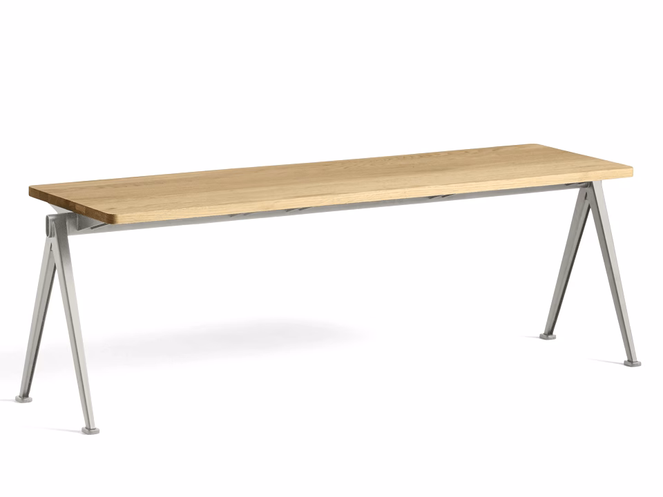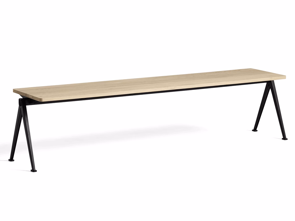 Designed to be functional, light and strong, the Pyramid Bench features a thin steel-sheet base with a rectangular oak top. Originally created by Wim Rietveld while working at Ahrend in the 1950s, the cutout steel collection has been relaunched by HAY together with Ahrend. The bench comes in two models and can be used as a low side table or seating solution in a wide variety of domestic or corporate contexts. Both variants are available in several wood finishes and base colours that can be coordinated with the Pyramid Table.