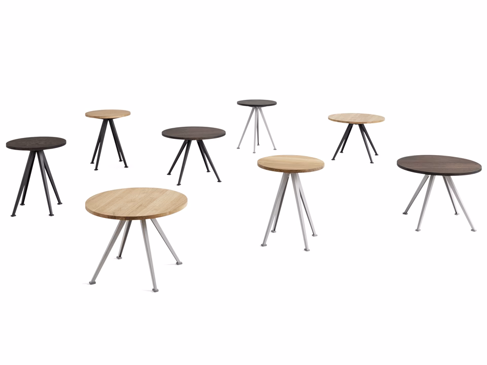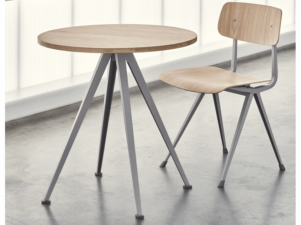 Designed to be functional, light and strong, the Pyramid Coffee Table features a round oak tabletop and thin sheet-steel legs that slant outwards, creating a functional and uncluttered expression. The cutout steel collection has been relaunched by HAY together with Ahrend. The table comes in three different sizes and is suitable for use in a wide variety of restaurant- and café contexts. All models are available in several wood finishes and base colours that can be coordinated with the Result Chair.