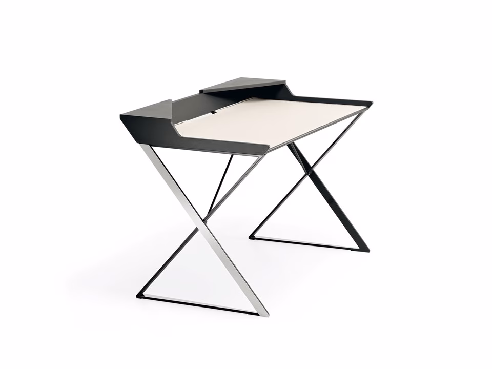 Desk with matt white (OP71) or graphite (OP69) painted frame and profile in polished stainless steel. Top in lacquered white (GF71) or graphite (GF69) embossed MDF. Leather pad as per sample card.