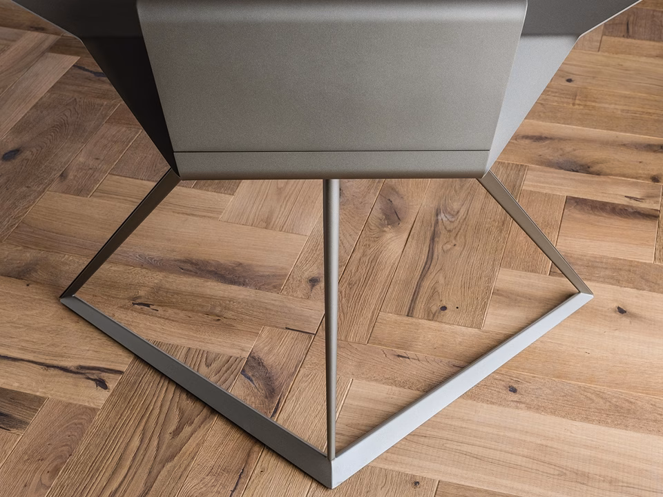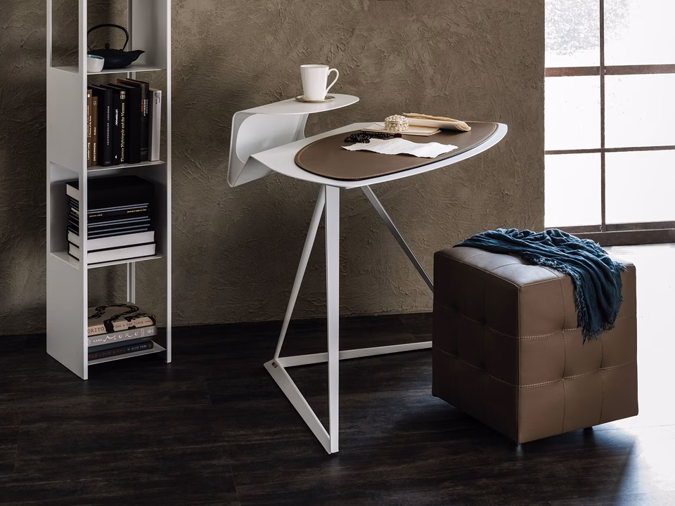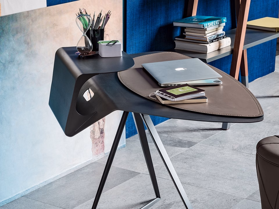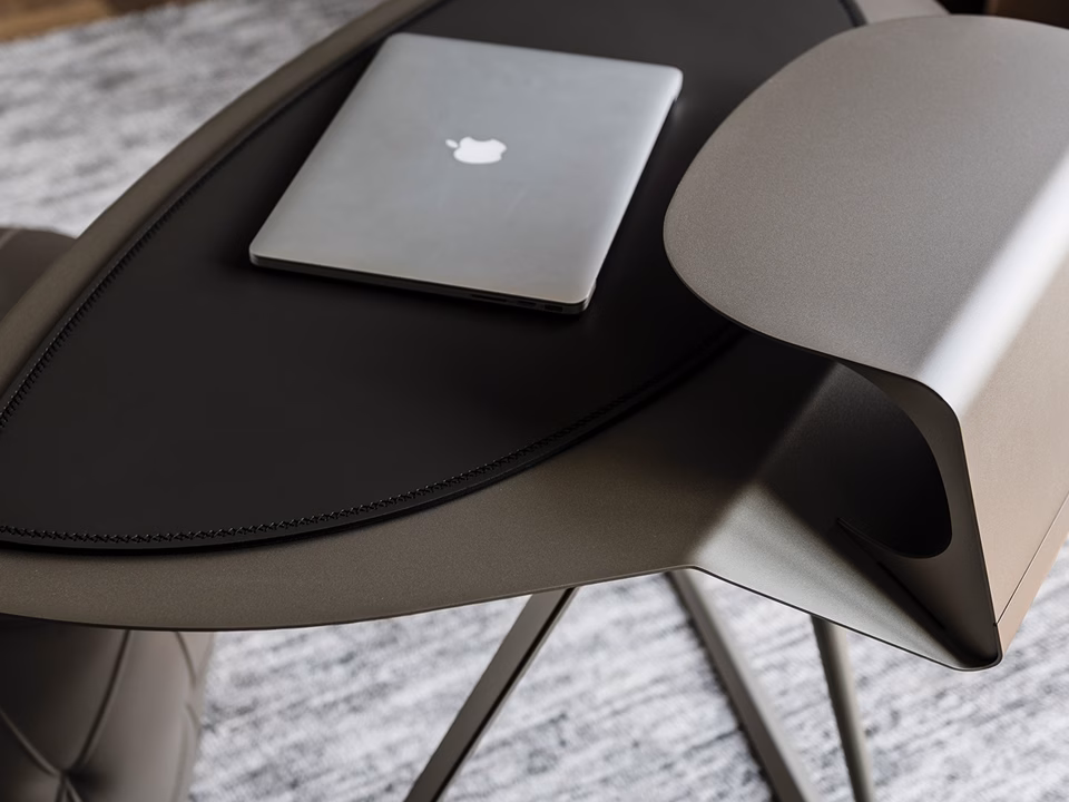 Desk with frame and top in titanium (GFM11), white (GFM71) or graphite (GFM69) embossed lacquered steel. Leather pad as per sample card.