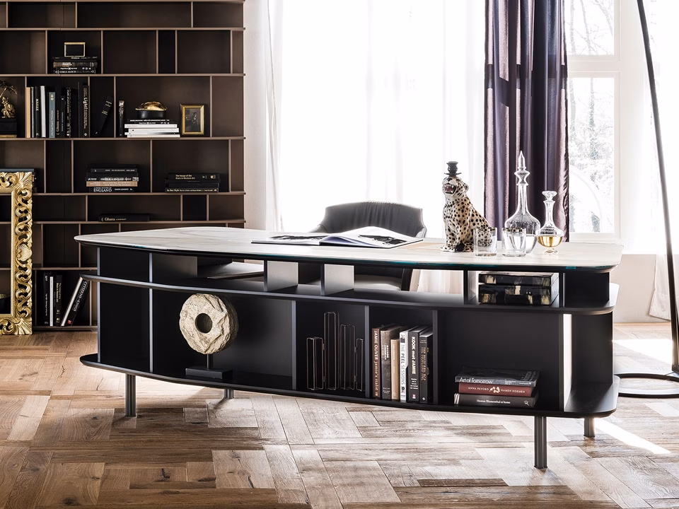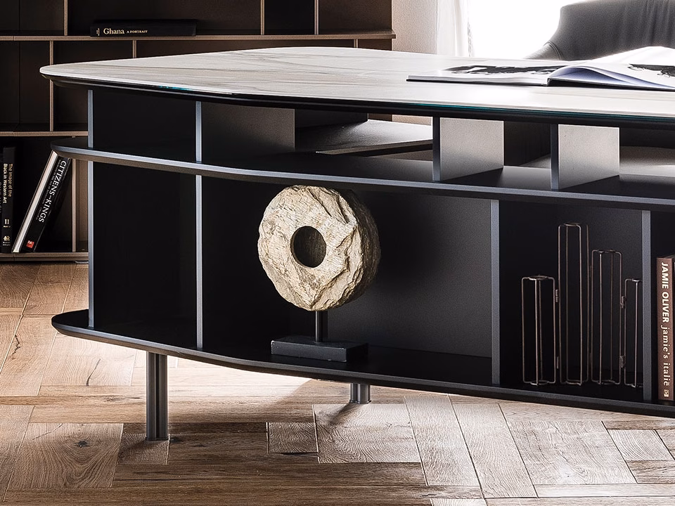 Desk in titanium (GF11), graphite (GF69) or black (GF73) lacquered embossed MDF. Top in ceramic Marmi Calacatta (KM01), Alabastro (KM02), Ardesia (KM04), matt Golden Calacatta (KM05), glossy Golden Calacatta (KM06), matt Portoro (KM07), glossy Portoro (KM08) or glossy Sahara Noir (KM09).