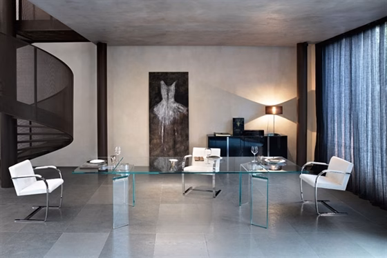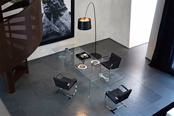 Detachable legs in 20 mm-thick curved glass, placed just under the top edge. Rotating mechanism in aluminium, gloss finishing and stainless steel plates. Sizes: |
