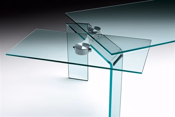 | Extensile dining table with 15 mm-thick tempered glass top and independent 52/41*cm-long extensions in 12 mm-thick in tempered glass.