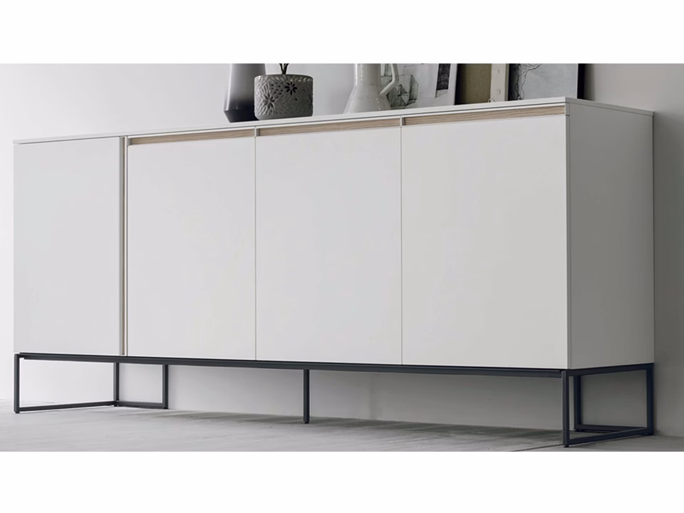 Regolo sideboard with a textured matt chalk white carcass, a textured eastern ash insert and anthracite 160 metal base.