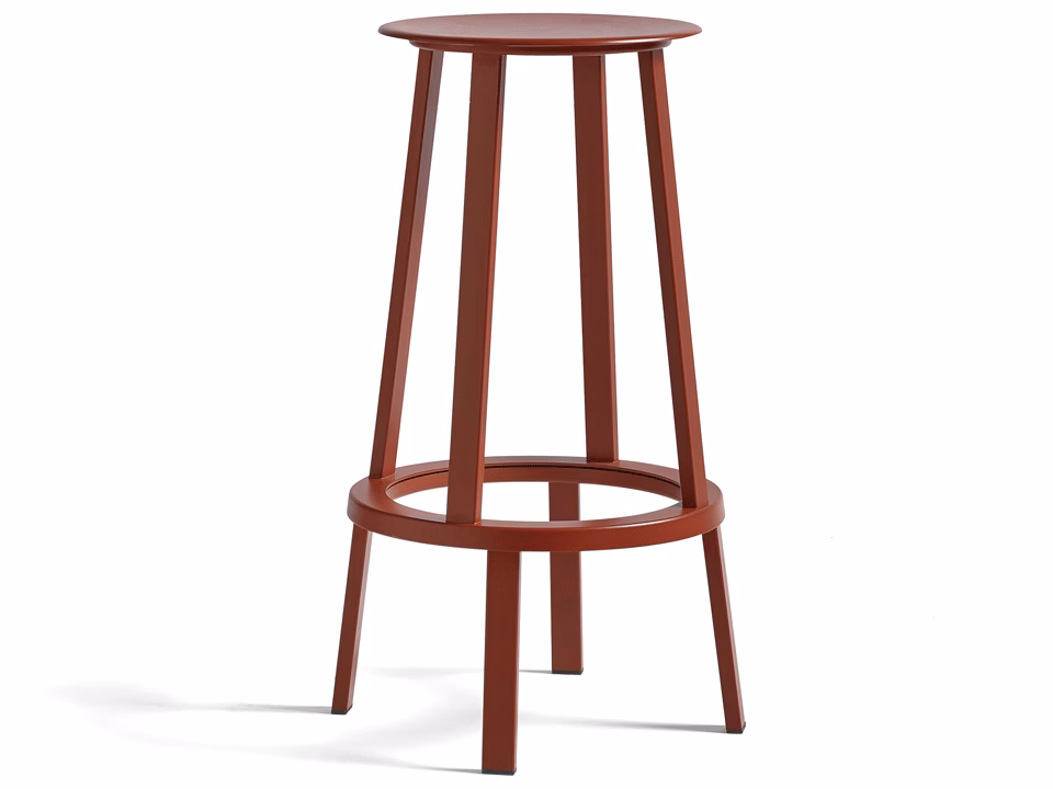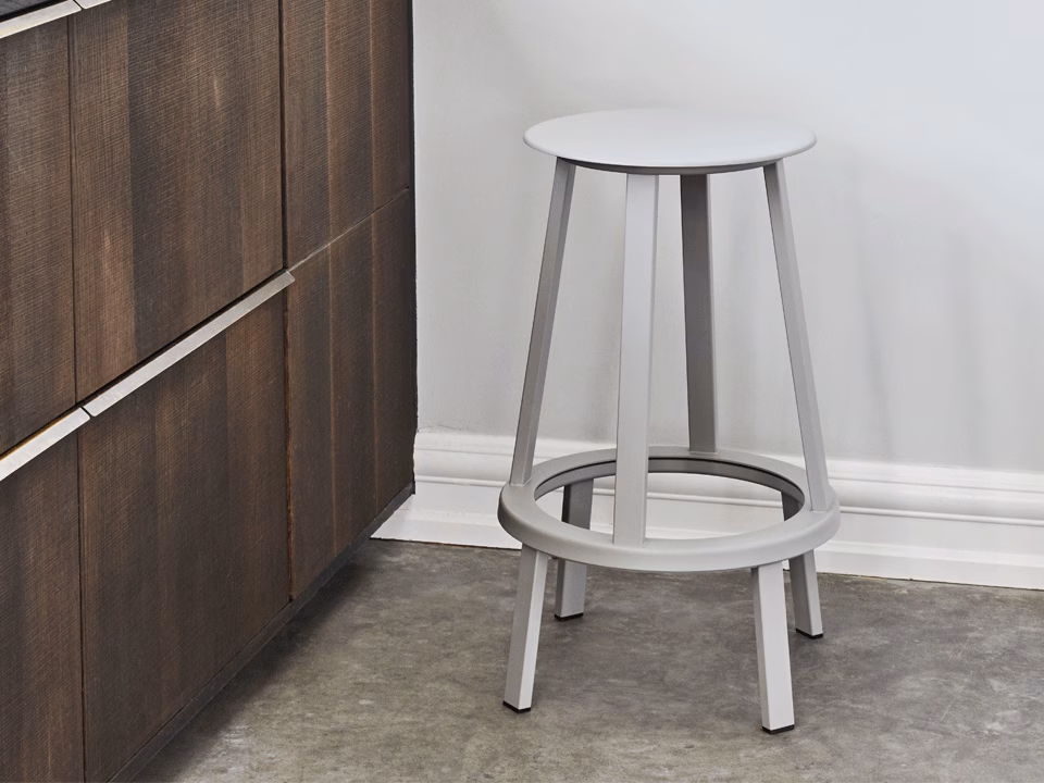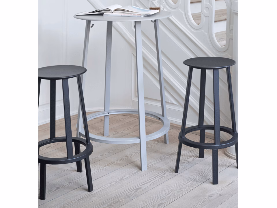 Sharing the same bearing mechanism as the Revolver Bar Stool, which enables the seat to rotate 360 degrees, Leon Ransmeier’s Revolver Stool offers a versatile and functional design. The slim, slightly dished seat with curved edges is offset by straight, angled legs, creating an uncluttered silhouette that offers limitless applications. Made in powder coated steel with a choice of colours, this lower version is suitable for a wide range of public and residential environments. Low suitable for kitchen counter. High suitable for bar table.
