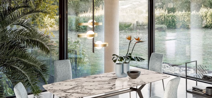 Bubble lamps feature precise, perfectly gauged geometry of staggered circles and spheres that contrast with the graceful metal support. Luminous planets and their orbits are evoked, a universe in perpetual motion that transmits a sense of dynamics and perfect equilibrium. The warm shades of the metal circumference enclose the beautiful pearls of light in an extraordinarily elegant, modern wall lamp