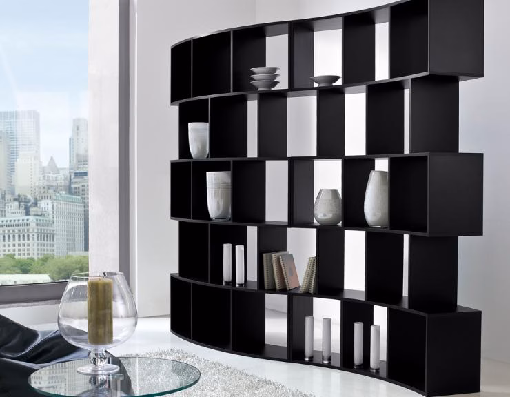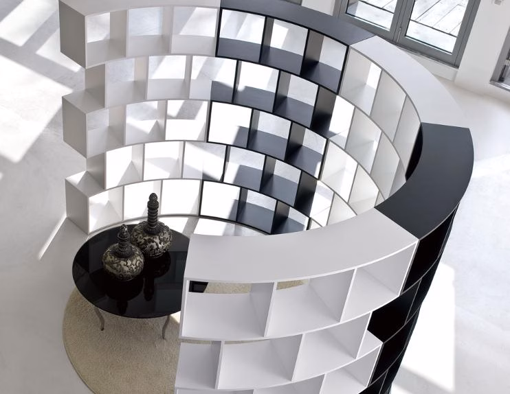 | Modular curved bookcase with wooden or lacquered matt wood frame.