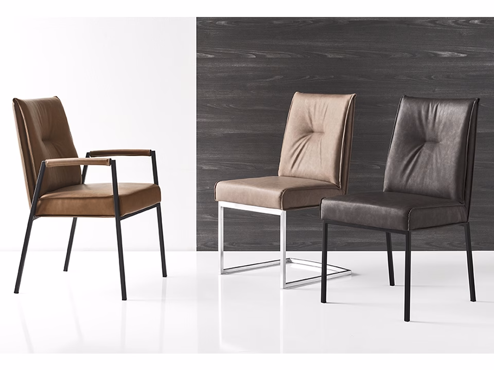 Modern and versatile, ROMY is a padded chair with flexible metal frame. The super-soft padded seat boasts an internal elastic-belt construction for maximum comfort and is covered in leather or leatherette. The padded armrests are covered to match the seat. Comfortable yet elegant, it fits seamlessly into your home’s dining area and, in this version, the office too.