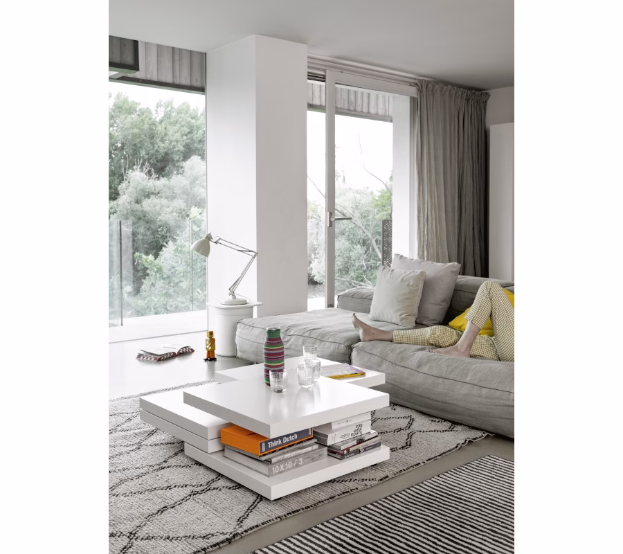 Rotor is a coffee table for the living room comprising five overlapping surfaces. The upper and lower tops are fixed, whereas the three middle tops can rotate 360°, providing various regular or irregular shapes that increase the surface area even four-fold. When completely closed, Rotor becomes a simple minimalist element, compact in size. The tops are available in different finishes: in wood, gloss lacquered colours and Fenix-NTM®® with a special matt effect.