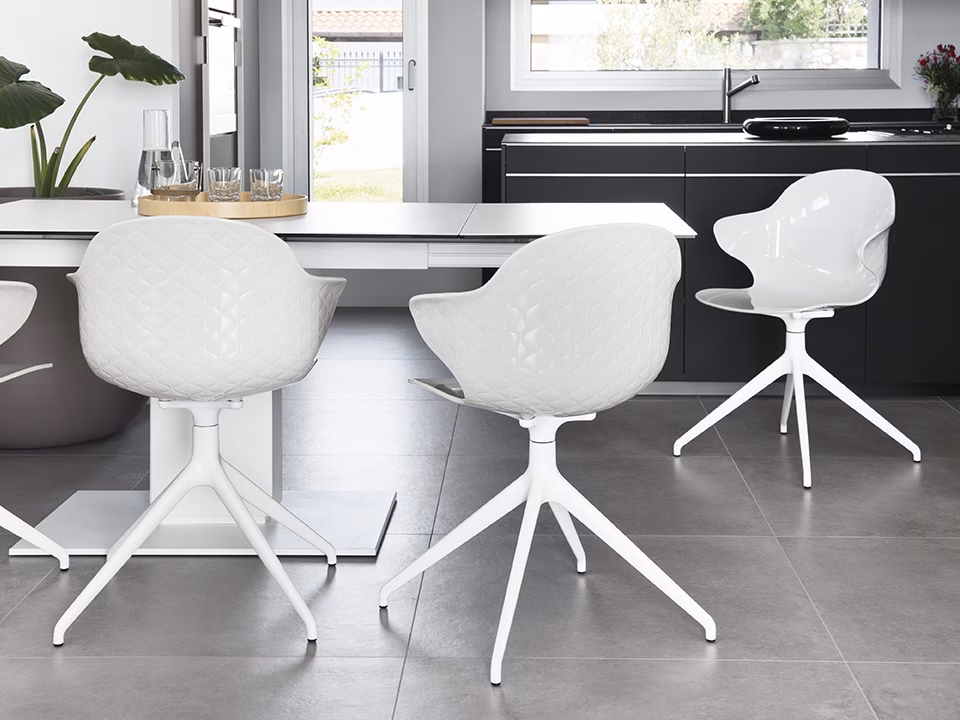 A creative spirit, crossroads between form and function, distinguishes the SAINT TROPEZ chair, boasting attention to detail and a sophisticated design with a quilted-effect backrest. The polycarbonate shell is made in a range of transparent and opaque shades and mounted on a stackable, four-legged metal base.