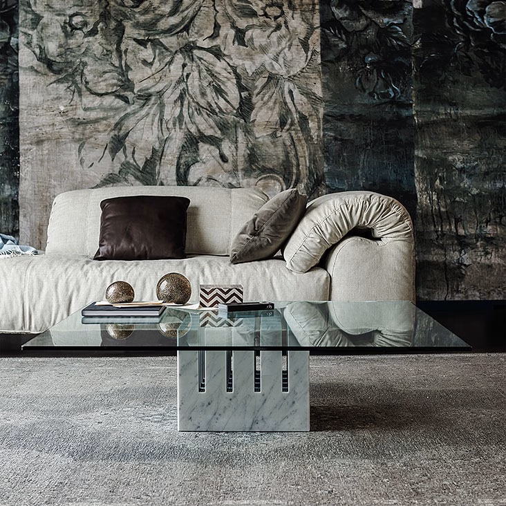Coffee table with white Carrara (BC) marble base. Clear glass top.