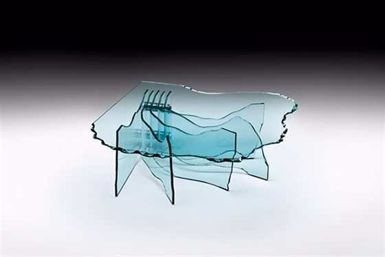 | Coffee table with hand-sculptured 15 mm-thick glass top.