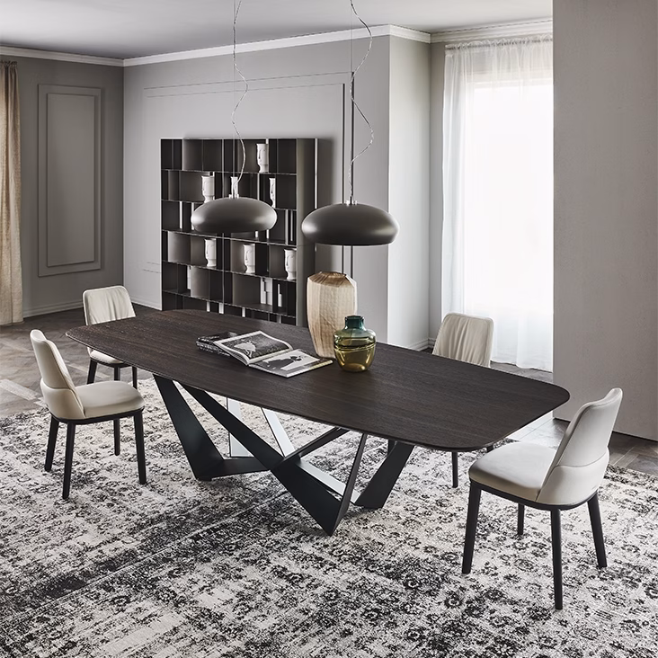 Table with base in titanium (GFM11), bronze (GFM18), graphite (GFM69), white (GFM71) or black (GFM73) embossed lacquered steel, Brushed Bronze or Brushed Grey lacquered steel. Version “A”: top with angled edges in Canaletto walnut (NC), Heritage oak (HR), burned oak (RB) or natural oak (RN). 4cm thick wooden top on 160×160 and 200×100 versions and 5cm on 240×120 and 300×120 versions. Version “S”: top with irregular solid wood edges in Canaletto walnut (NC), burned oak (RB) or natural oak (RN), 4cm thickness. Vesion “B”: barrel top with angled edges in Canaletto walnut (NC) or burned oak (RB). Version “C”: top in Canaletto walnut (NC) with Brushed Grey lacquered and rounded lower profile or Elm open pore matt black (OLM73) with Brushed Bronze lacquered and rounded lower profile. “Masterwood” version: boat shaped in