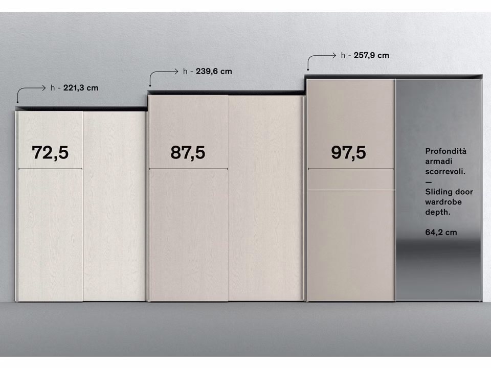 The sliding door wardrobe is a functional solution capable of optimizing the available space. Solution featured in the catalogue available in all finishes, interiors in nuvola finish.