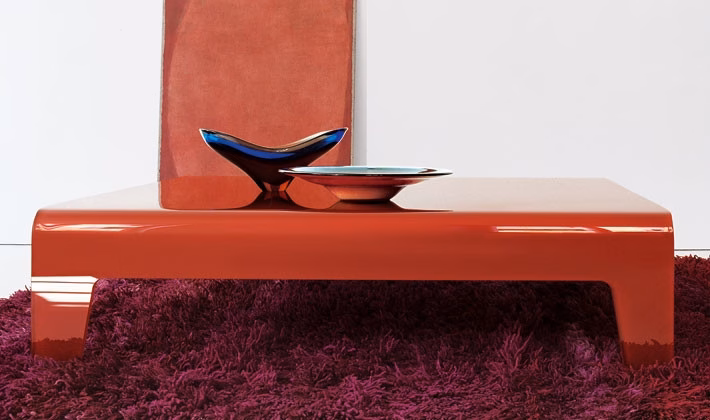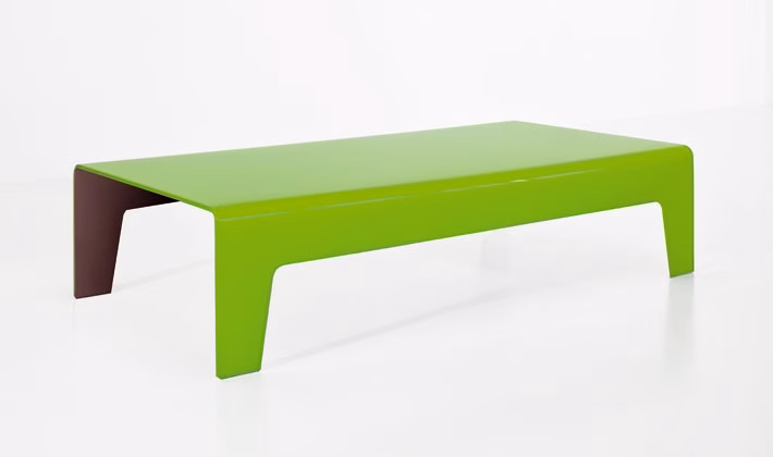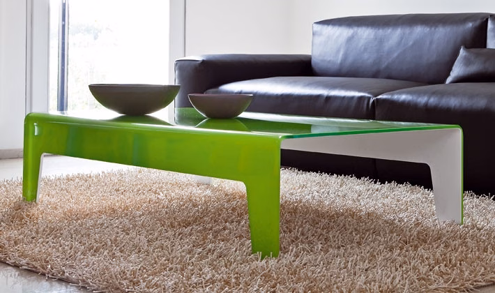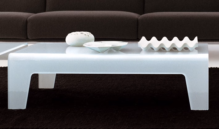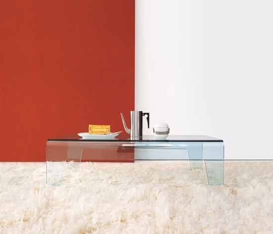 Extralight clear or lacquered mono or two-tones, bent glass coffee table. Smoked finish available only in the rectangular version.