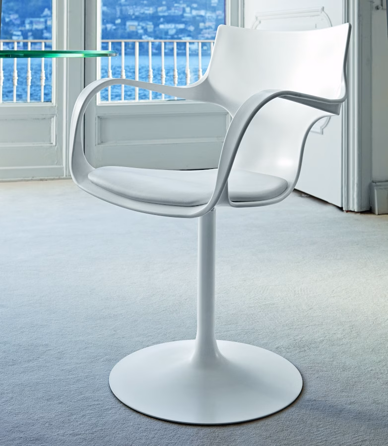 Flûte is a swivel chair that is ideal for different places such as home and office. It is available with polished chrome or lacquered metal structure. The comfortable seat with arms is in white, black or mocha polypropylene. The fake leather cushion makes the seat more comfortable.
