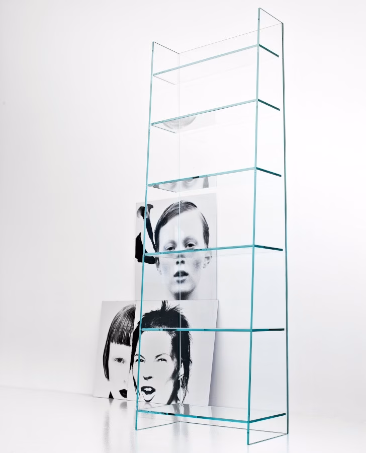 Minimalist boockcase in extraclear glass. Extralight display / bookcase in glued glass