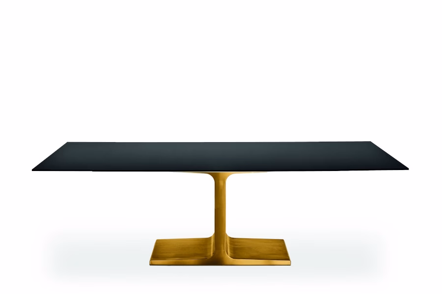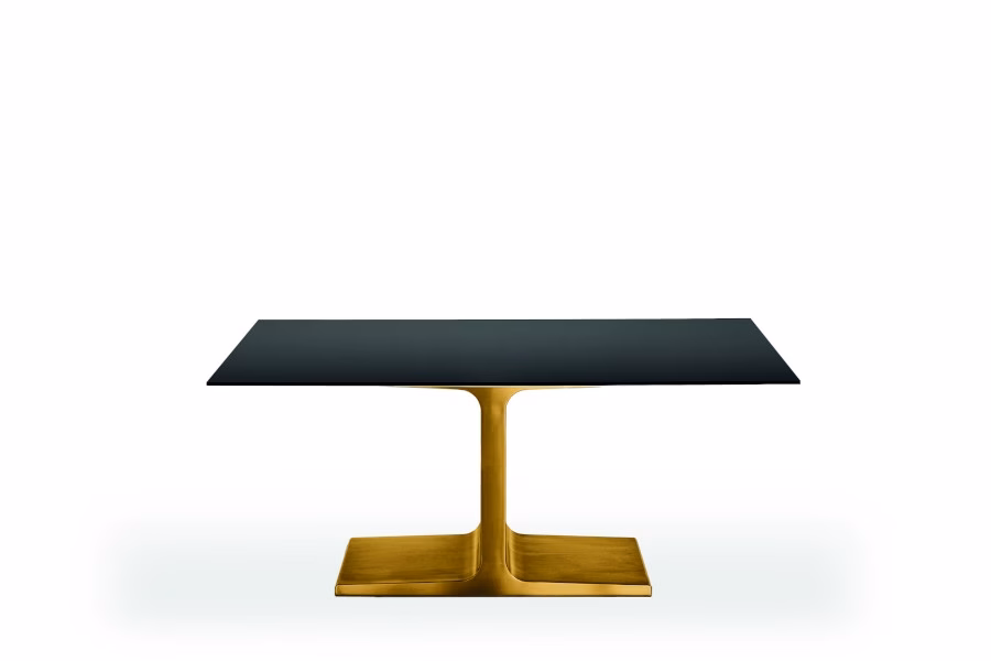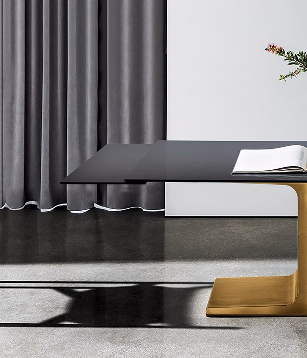 Extensible dining table with lacquered metal base, various finishes, or burnished finish. Tempered or laminated top in different measures, materials and finishes. Extensible structure with aluminium finish.