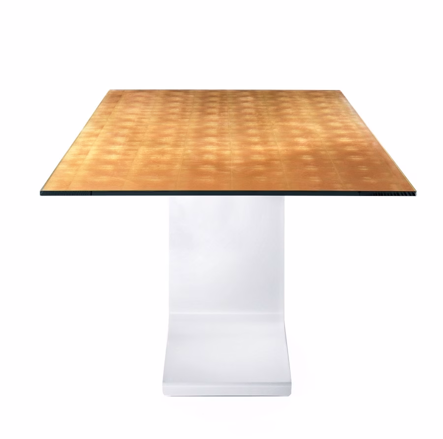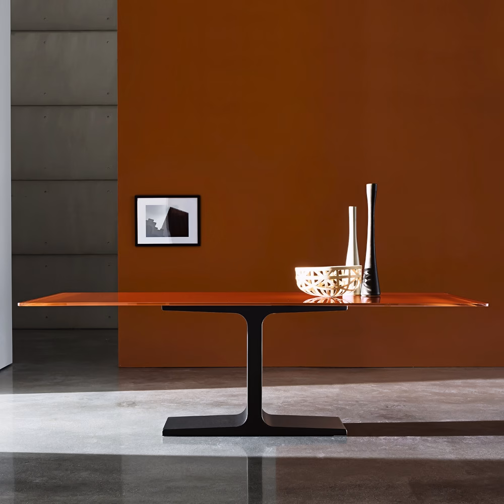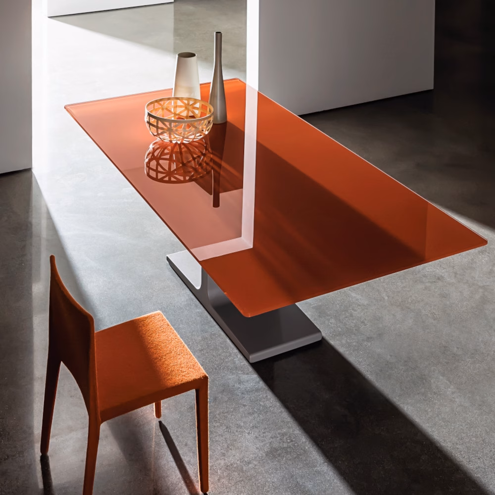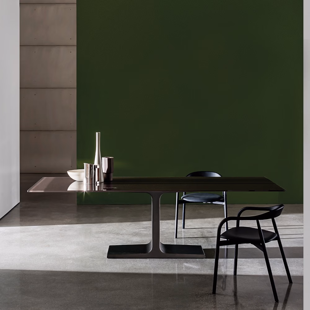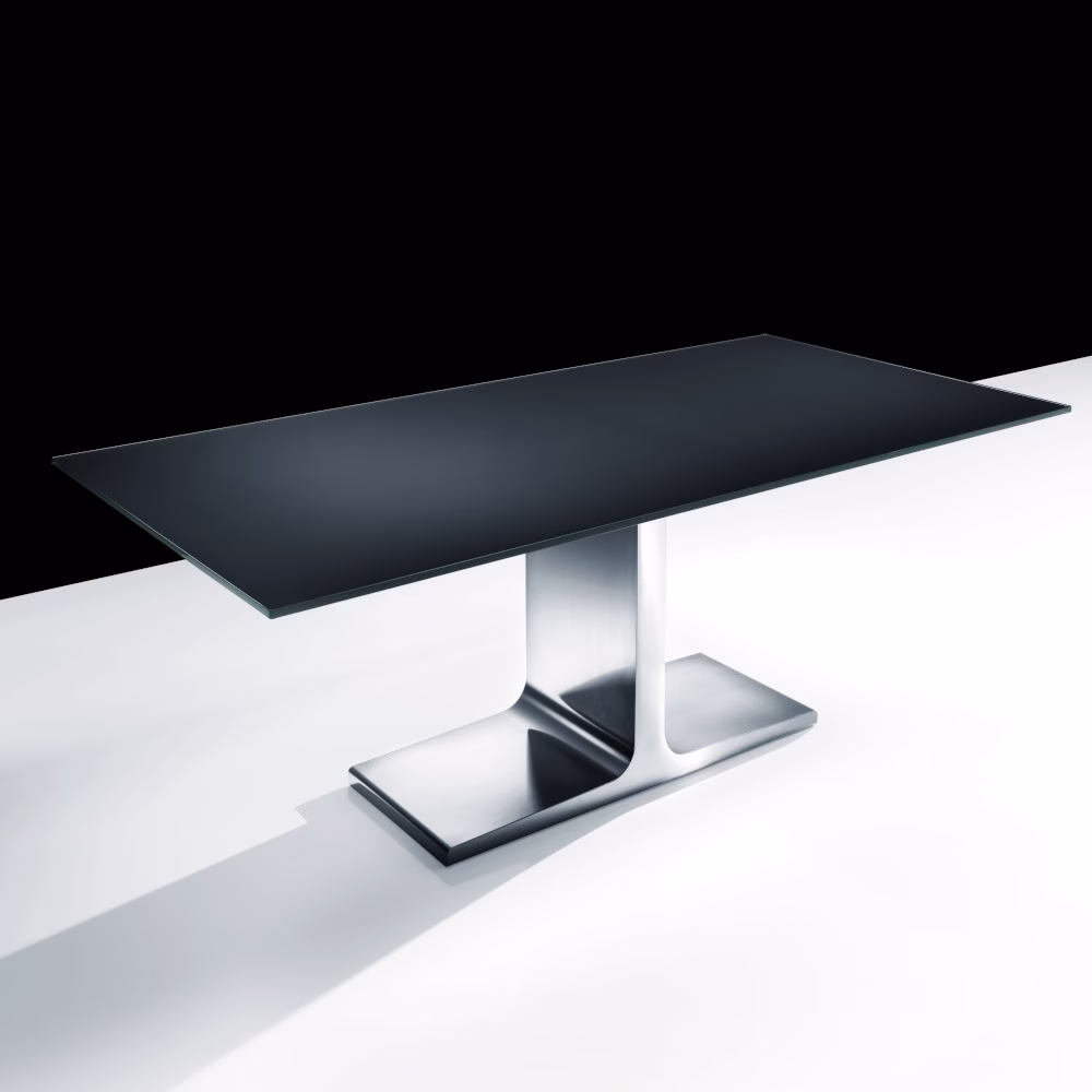 Dining table with base in mat stainless steel, in lacquered metal various finishes or burnished finish. Lacquered tempered glass, wood or ceramic top, various finishes.