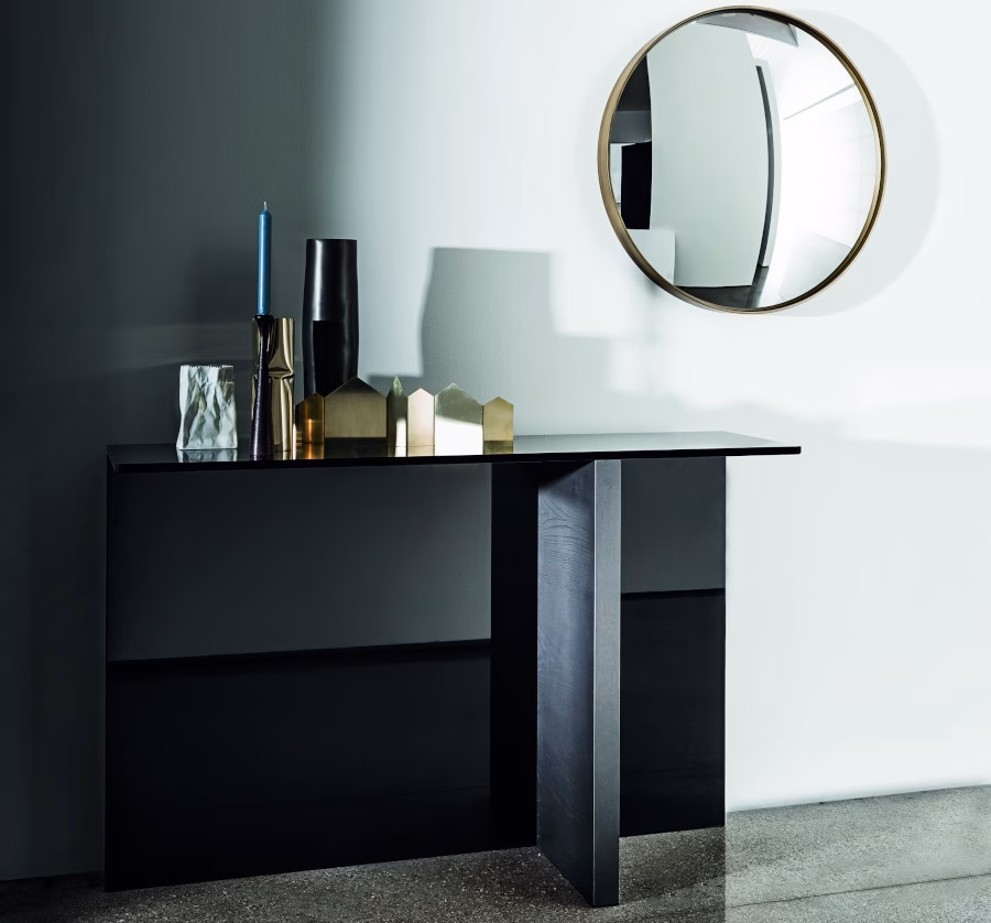 Console with smoked laminated glass top. Base composed of a wooden element, various finishes, and a black lacquered glass element.