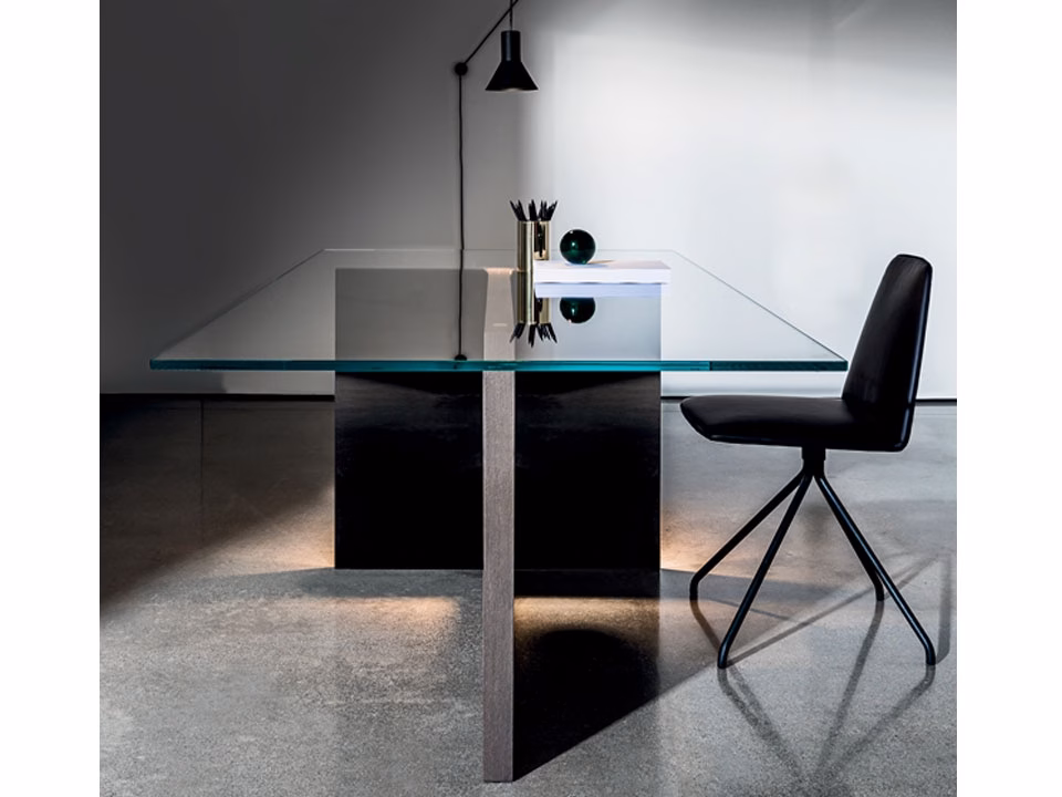 - Wooden element, various finishes, and a black lacquered laminated glass element.