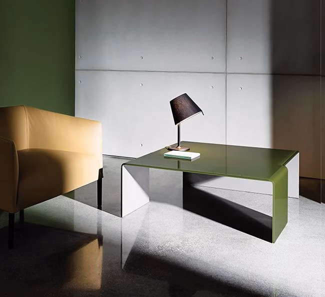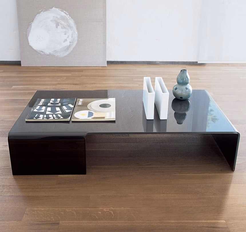 Extralight, smoked or lacquered mono or two-tones bent glass coffee table.