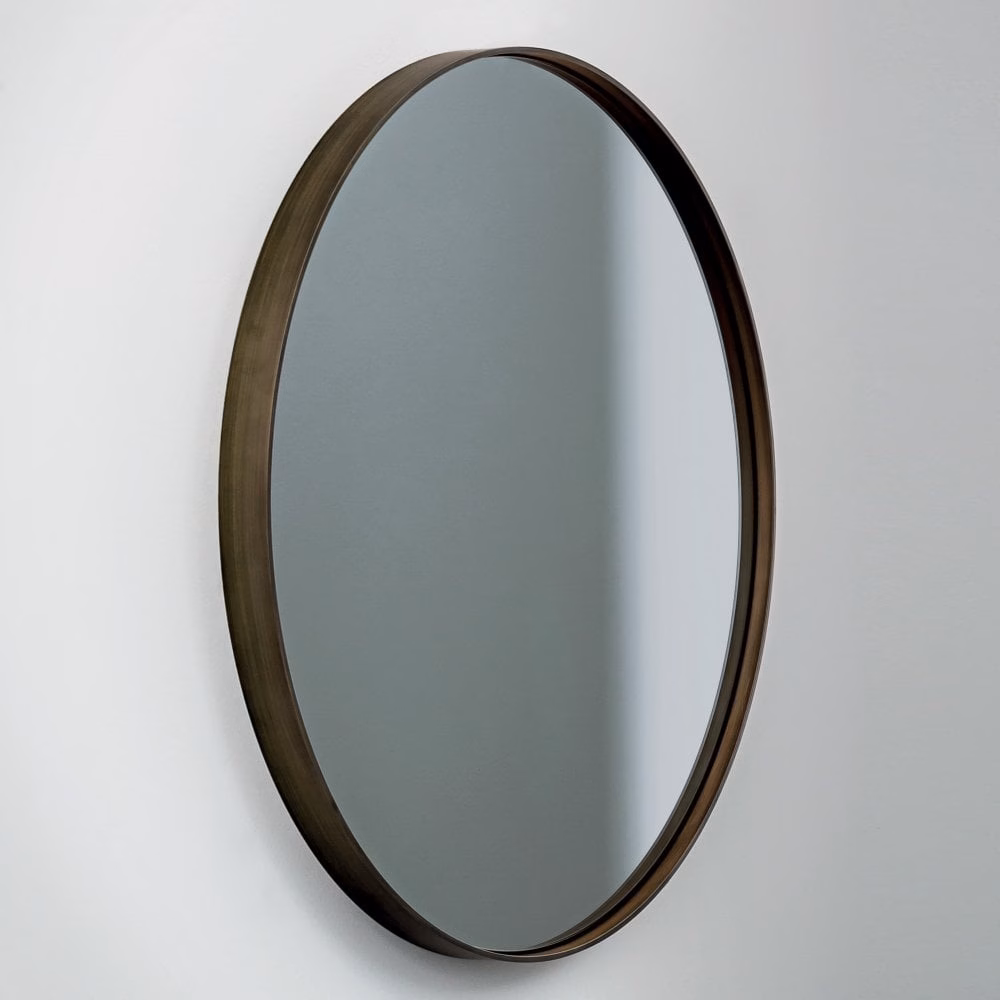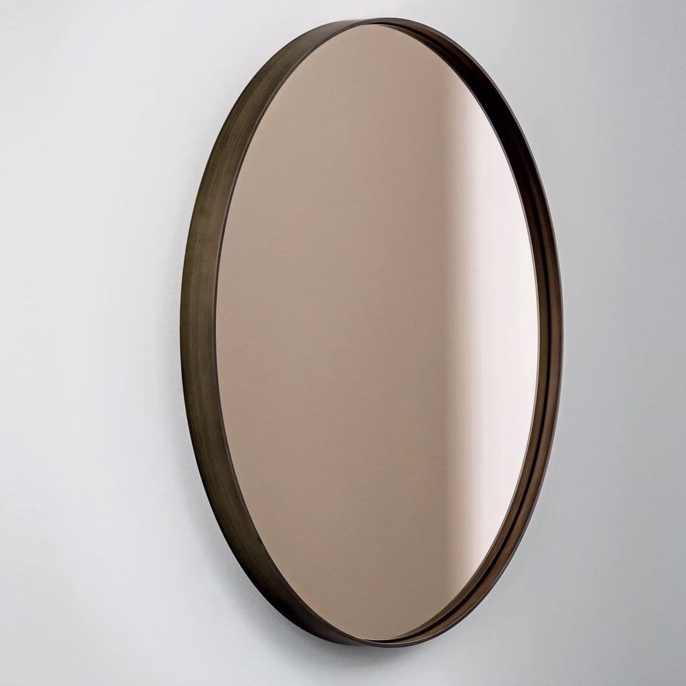 Round wall mirror with lacquered metal frame, mocha or burnished brass finish. Central mirror available in different shades.
