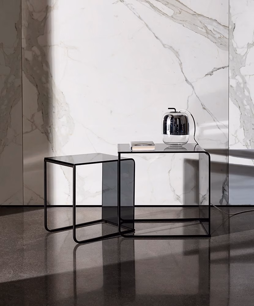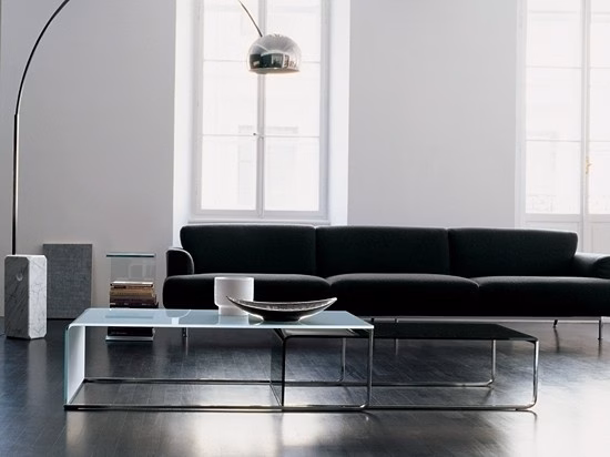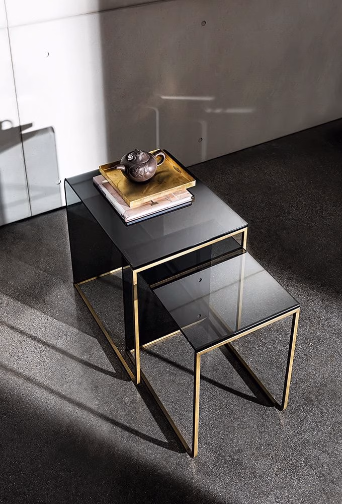 Curved glass and metal profile are joined together to create a single form, able to create different chromatic combinations and types of furniture: from the coffee table to the console. An idea that can satisfy different needs with a unique style.