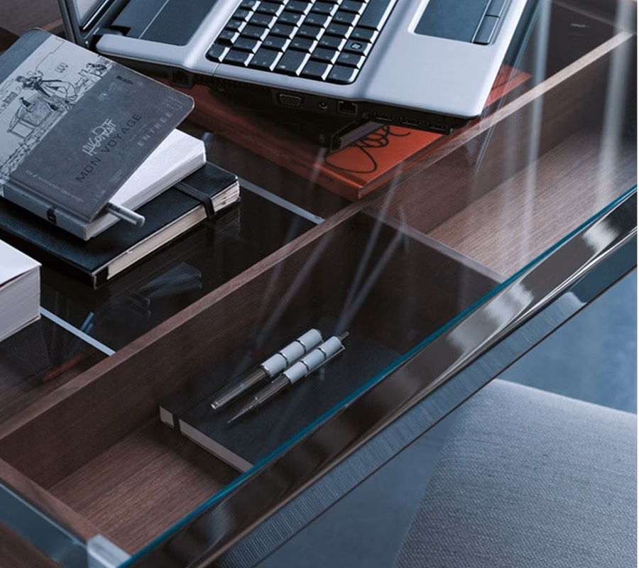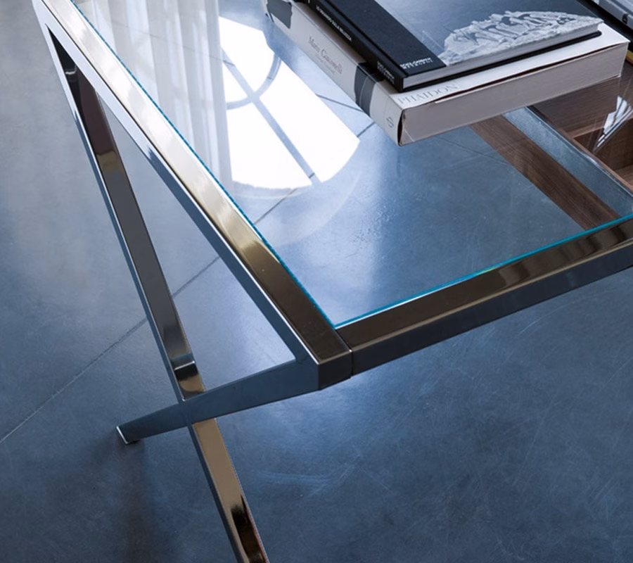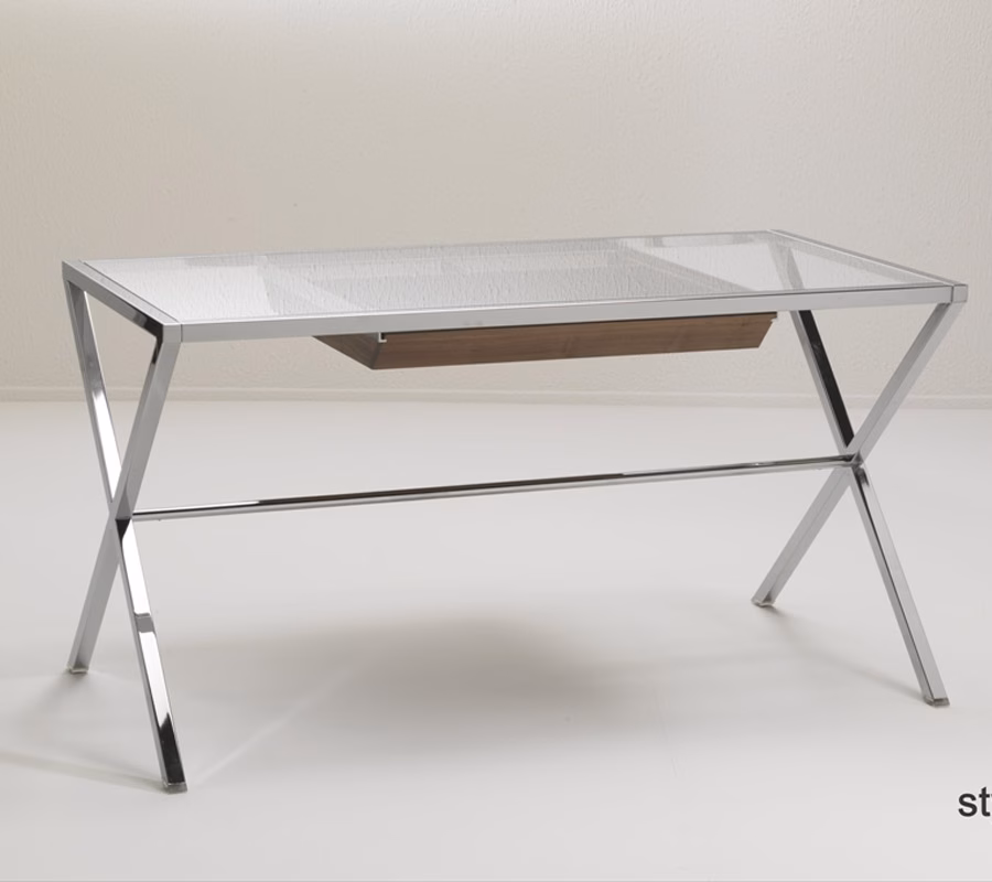 -8mm tempered extralight clear glass top -Chromed metal frame -Drawer in solid walnut