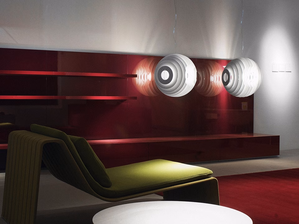 Supernova is a newly-born star, but its name also means “very, really, extremely new”. Just like this light whose volume is determined by two-dimensional surfaces. Supernova is a sphere, made up of 7 pairs of discs of different forms, attached in sequence onto a slightly curved suspended metal bar.