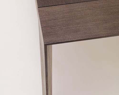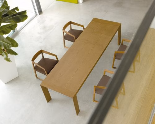 | Surface extendible table, oak veneered wengé stained, walnut veneered or white laquered beech no visible grain finish. Thick and tapered legs give to the table both stability and a touch of lightness.