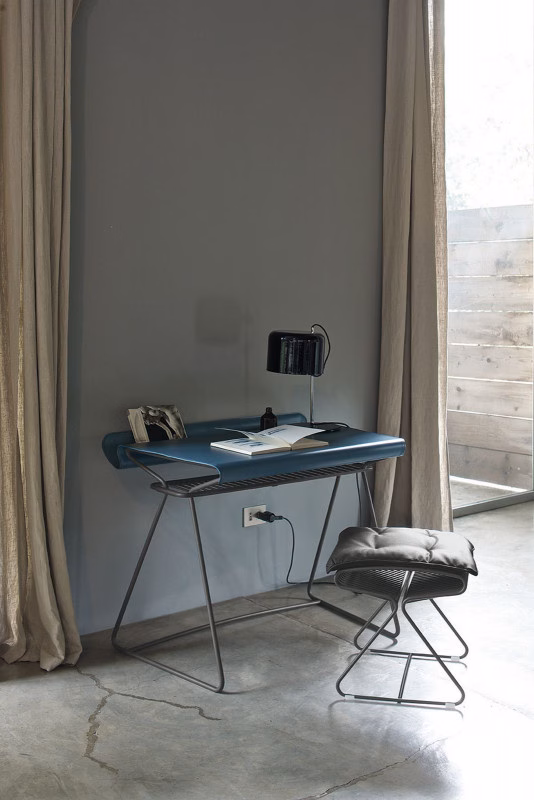 Desk with lacquered metal frame in various colours, top covered in hide leather either with constrast or matching stitching.