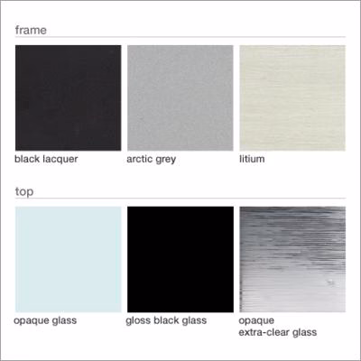 Frame available in black lacquer, arctic grey and litium with a clear, opaque, opaque extra-clear or gloss black glass top.