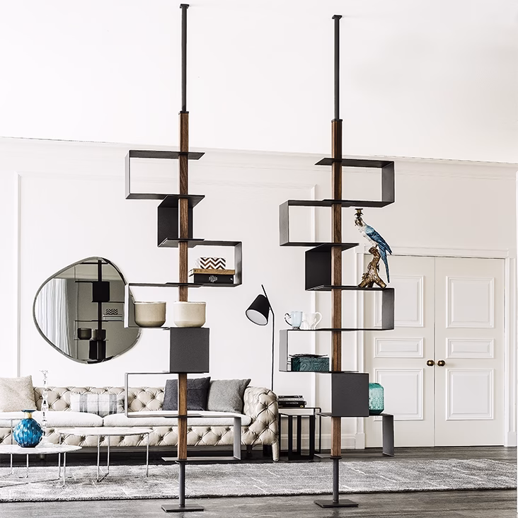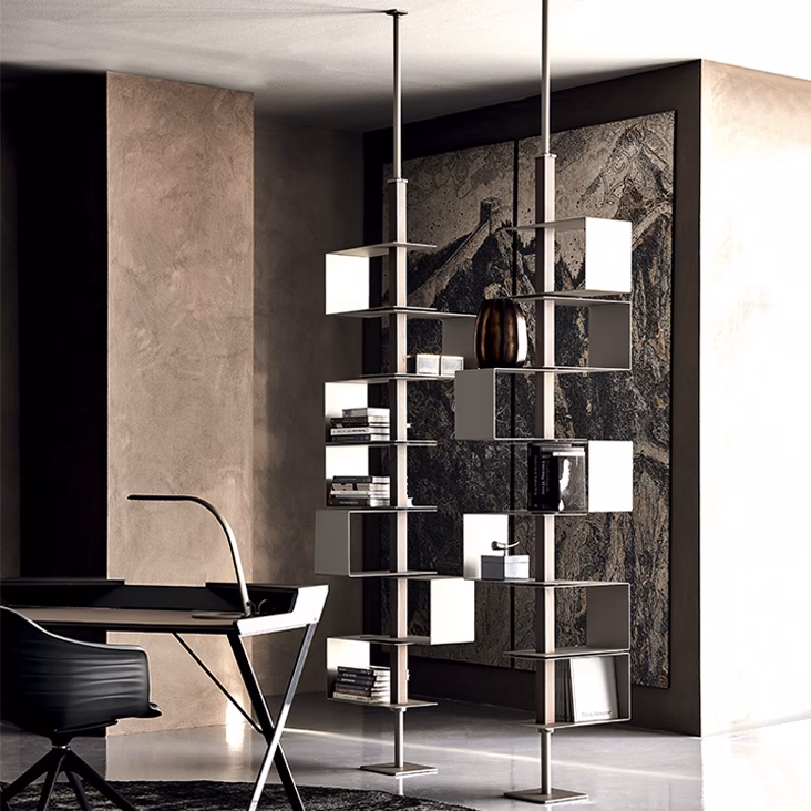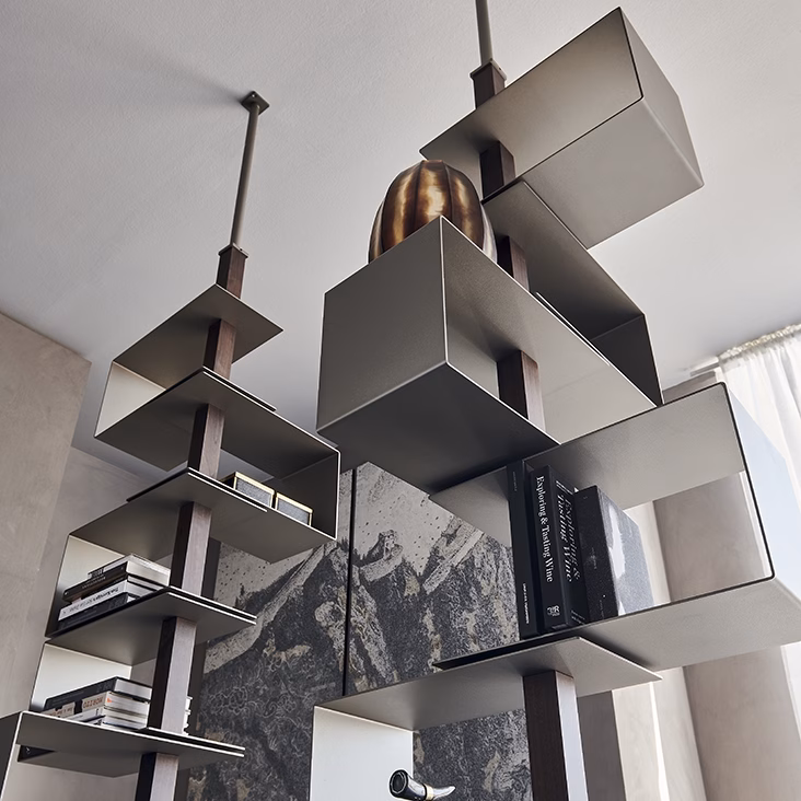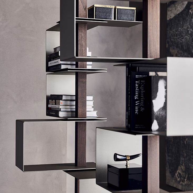 Bookcase with frame and shelves in titanium (GFM11), graphite (GFM69), white (GFM71) or black (GFM73) embossed lacquered steel and Canaletto walnut (NC) or burned oak (RB) inserts. Max capacity: each shelf kg 4.