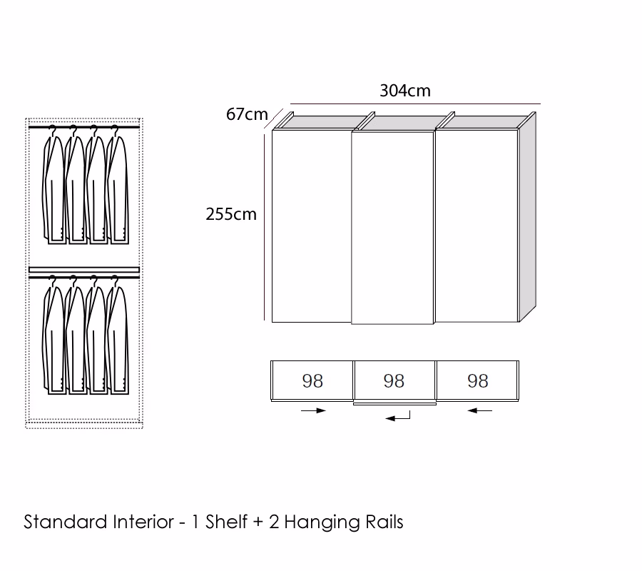 Standard INTERIOR fittings include one shelf and one hanging rail per cabinet however this can be altered to suit your needs, to make it easy we have attached a selection of designs to show what can be achieved.
