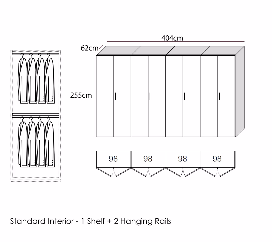 Standard HEIGHT units are 236, 255 and 287cm however this can be customised to fit.