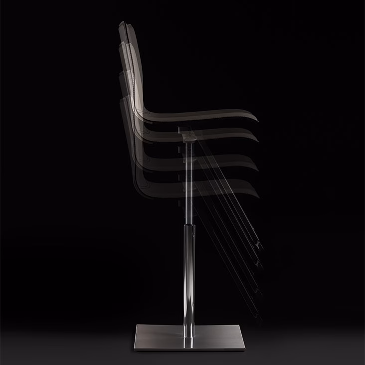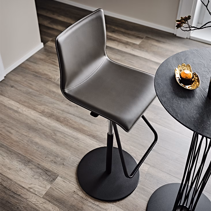 Swiveling and adjustable in height stool with satin stainless steel base plate and column, footrest and gas piston in chromed steel (08) or with base plate, column, and footrest in black (GFM73) embossed lacquered steel and gas piston in chromed steel (08). Seat covered in leather as per sample card. Available with round base on demand. Standard or in contrast stitching.