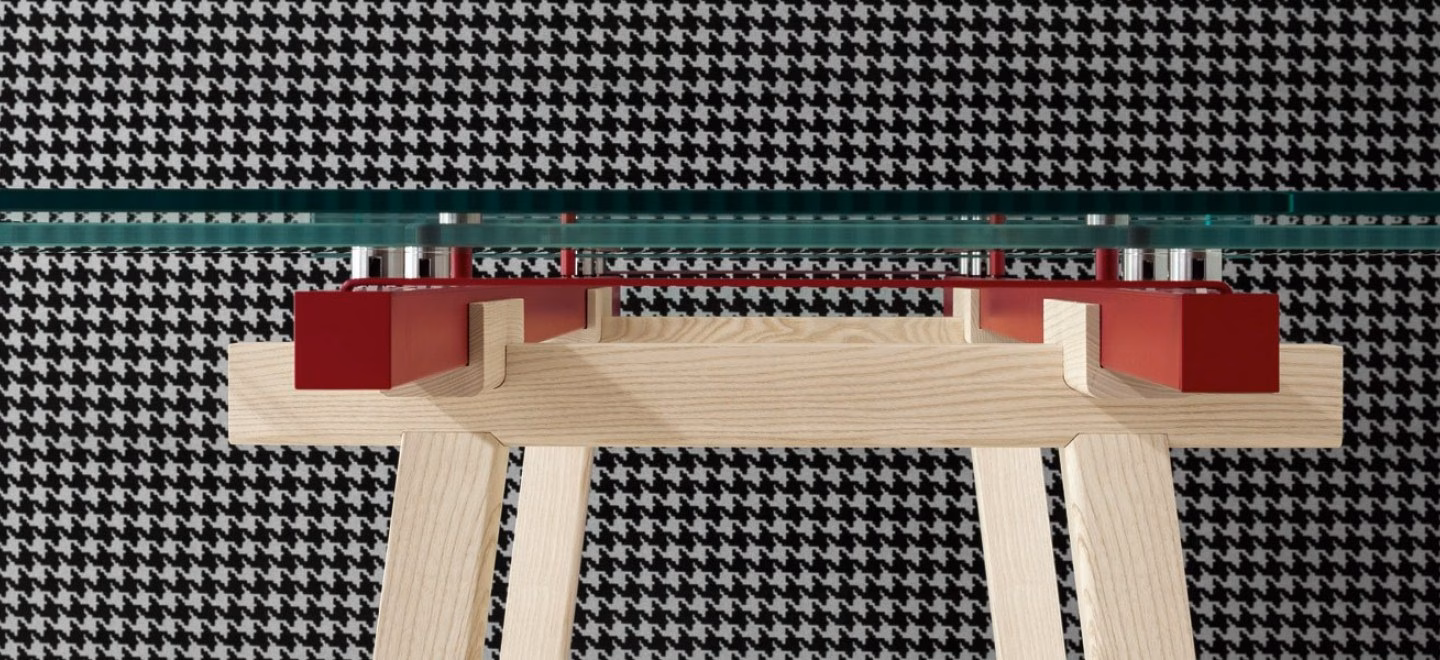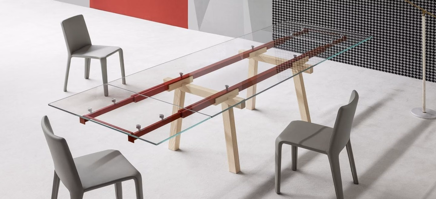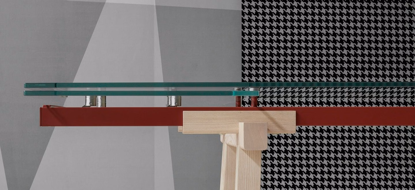The “tracks” are two parallel steel beams which make up the table top extension mechanism and are clearly visible, from the top and from the side, thereby becoming the fundamental feature which determines the styling of the table.