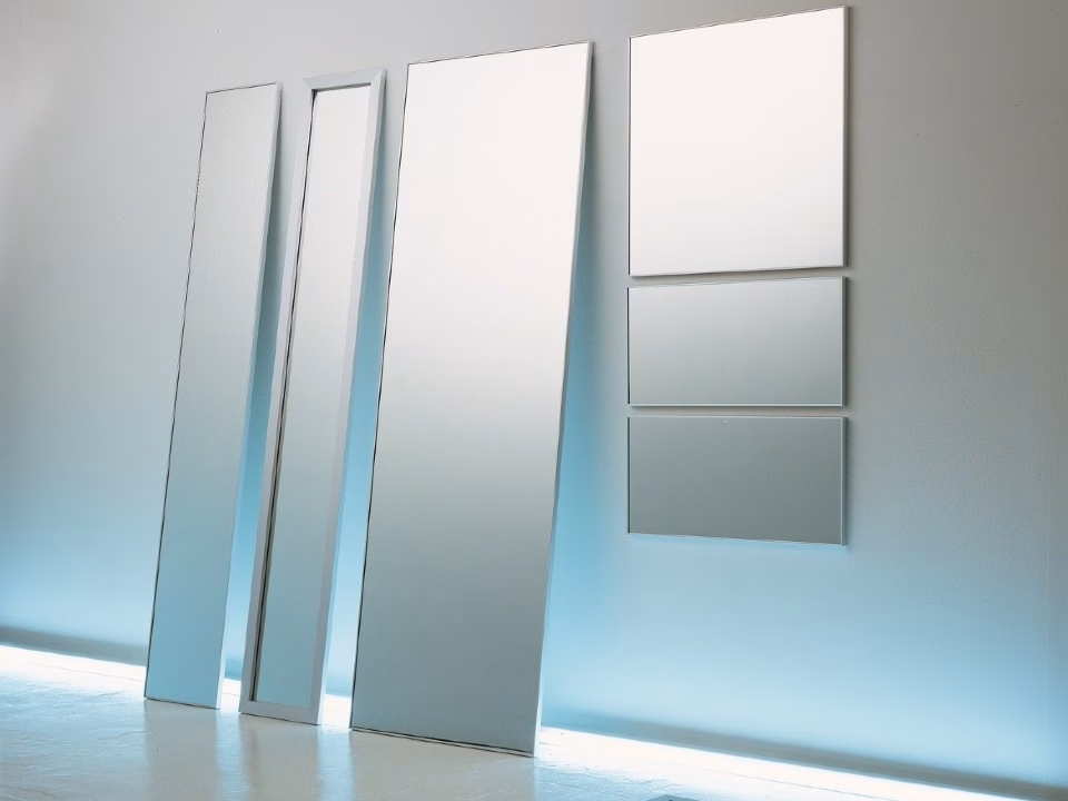 Ute mirrors can be hung horizontally, vertically or, in larger sizes, placed on the floor. Ute is presented with two aluminium-frame versions: the “minimal”, subtle and almost imperceptible one, and the “millerighe” (striped) one, characterised by an embossed-line texture, making the collection suitable for any environment, both domestic and commercial.