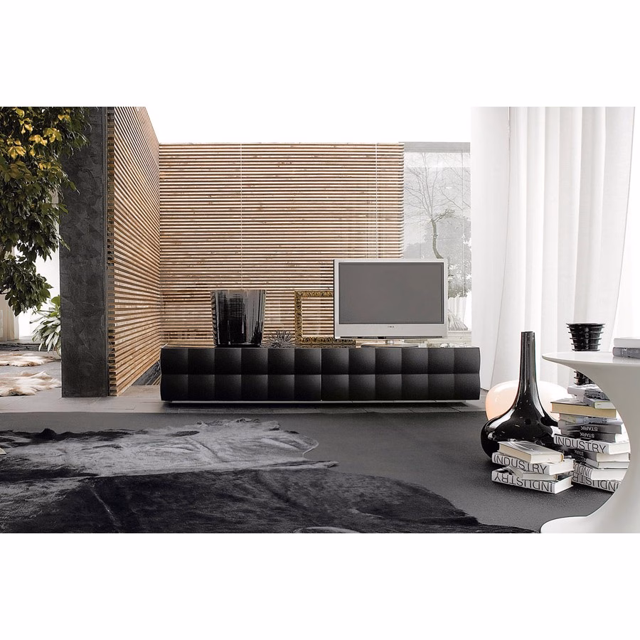 Beautiful and modern tv stand with 2 big drawers in button-tufted lacquered wood with tempered glass top and chromed metal base.