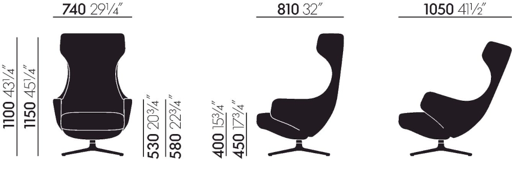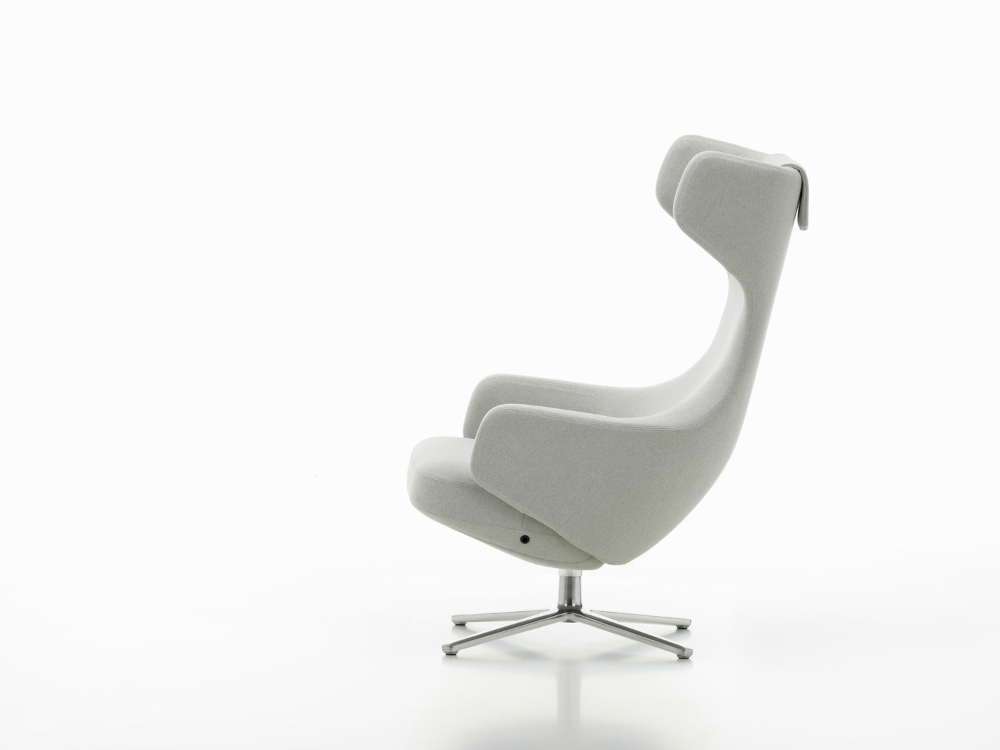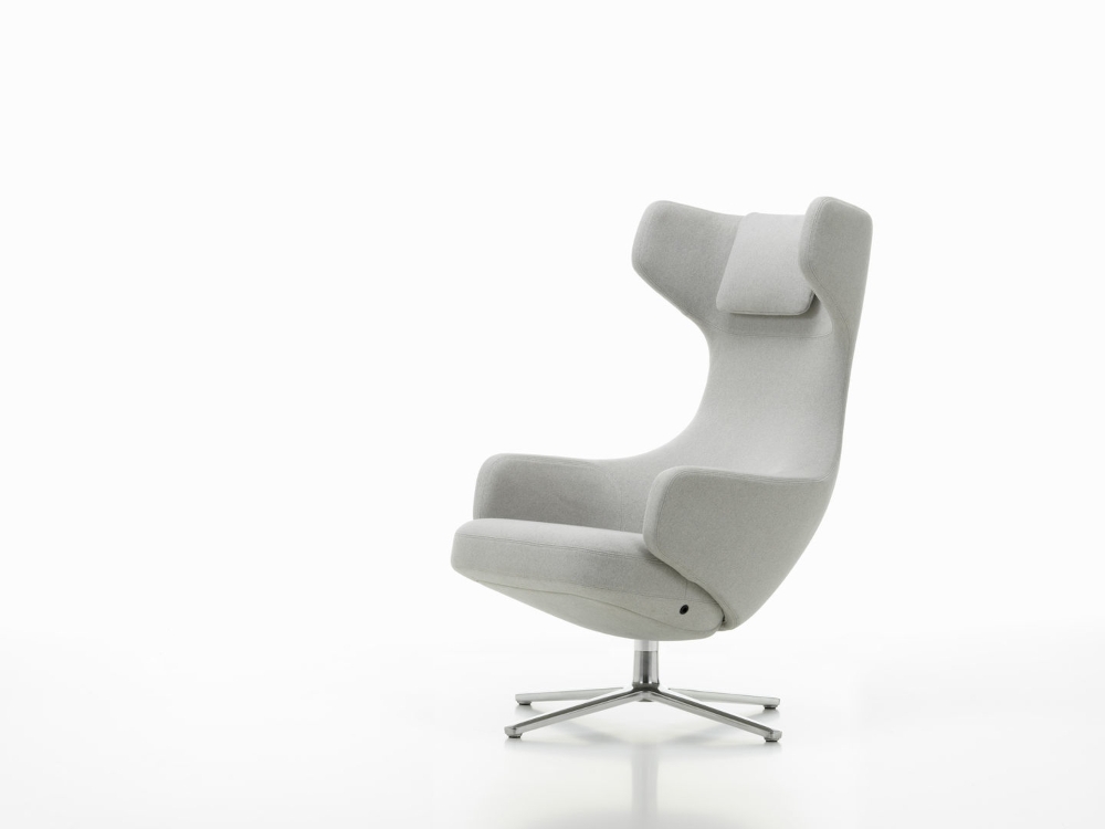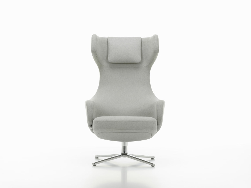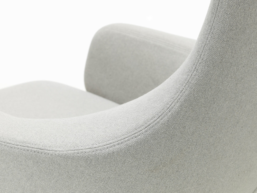 A synchronised mechanism is concealed beneath the upholstery of the Grand Repos wing chair and can be locked in any position, for optimum back support and utmost comfort at any reclining angle. The characteristic head section invites the user to lean back and creates a sense of shelter and seclusion. The decorative seams in the fabric or leather upholstery of some versions lend the armchair an almost artisanal look.