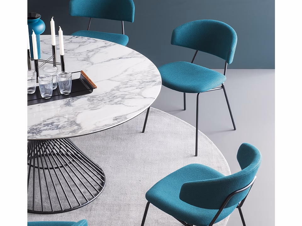 A round table creates a strong sense of belonging between people, aiding conversation simply by its shape. This feeling is accentuated with VORTEX thanks to its decorative and functional central base which, with its helical metal tube frame, gives the table a personal touch. The glass or glass-ceramic top fits perfectly with the metal base and is secured to the frame by three circular steel plates.