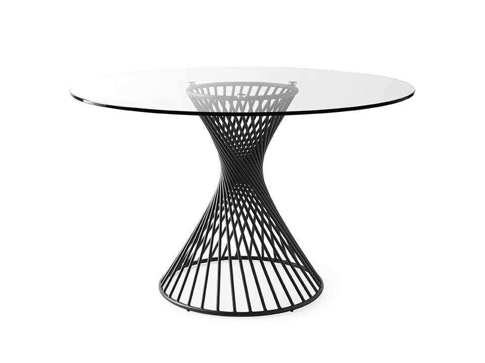 A round table creates a strong sense of belonging between people, aiding conversation simply by its shape. This feeling is accentuated with VORTEX thanks to its decorative and functional central base which, with its helical metal tube frame, gives the table a personal touch. The glass or glass-ceramic top fits perfectly with the metal base and is secured to the frame by three circular steel plates.