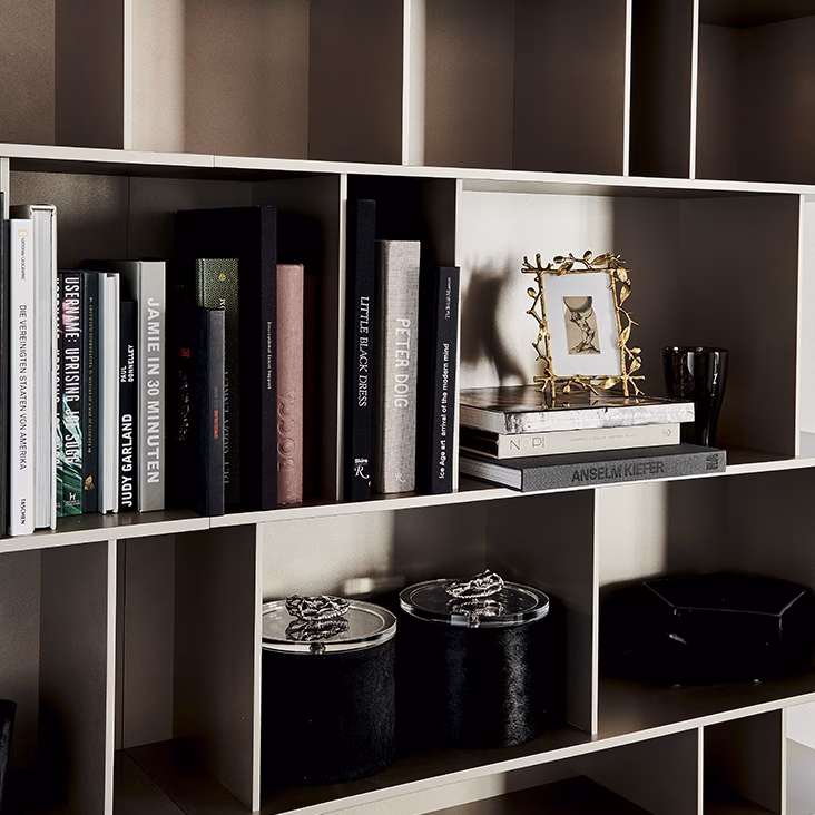 Modular bookcase in titanium (GF11), graphite (GF69) or white (GF71) lacquered embossed MDF. Max capacity: kg 40 (B), kg 20 (P) spread load. Wall anchorage is necessary.