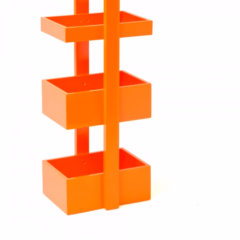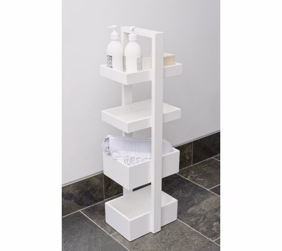 Stunningly finished in a super shiny, sleek, smooth gloss, epoxy White or orange. Vibrant colours contrast boldly making this the accent piece in any contemporary en-suite ensemble. Supremely functional the design provides four trays for storage, two slim trays at the top and two deeper trays below. Ideal for rolled towels, body lotions, toiletries and gels
