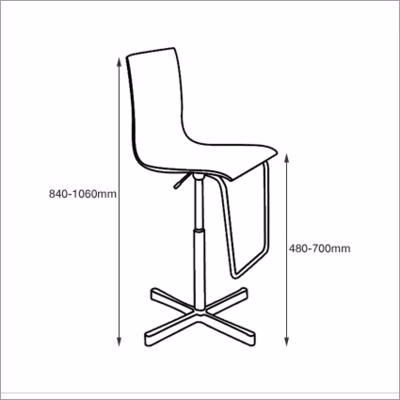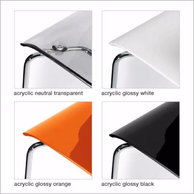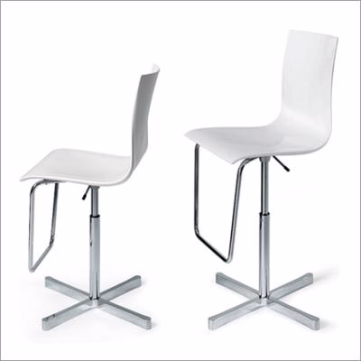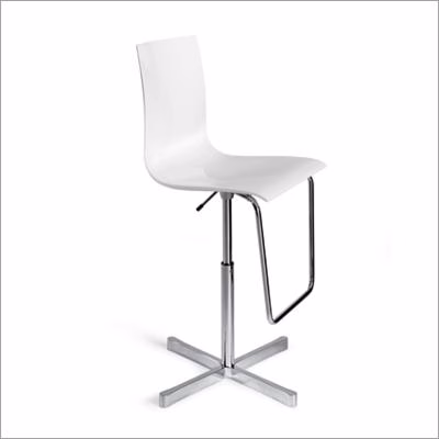 Swivelling chair with 4 star base. Die-cast aluminum and steel tube base. Variable height with gas elevation. The foot-rest in chromed steel for all versions. Acrylic body also available with hand-sewn finish in the variations of the sample case.